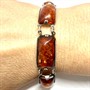 Elegantní, nadčasový jantarový náramek. Šperk byl zhotoven ze stříbra ryzosti 835/1000, o celkové váze 18,37 g. Šperk je tvořen podlouhlými články, z nich je každý osazen krásně zbarveným, bohatě inkluzovaným jantarem. Praktický, pojistný řetízek proti ztrátě. Délka cca 19 cm. Výborný stav.