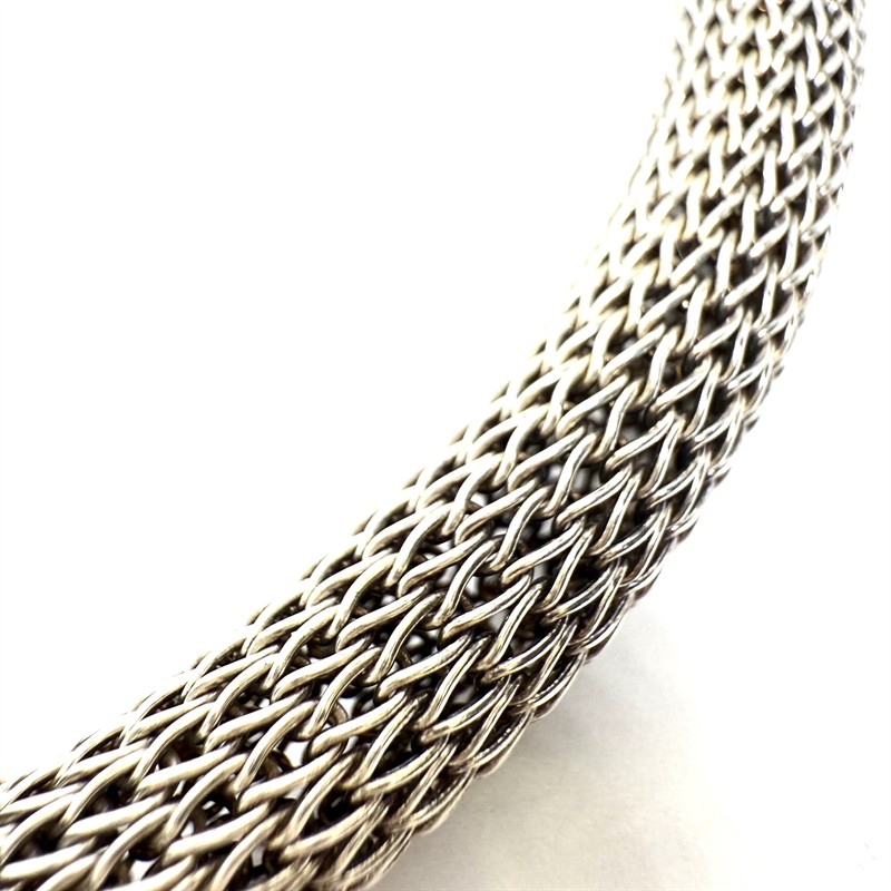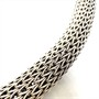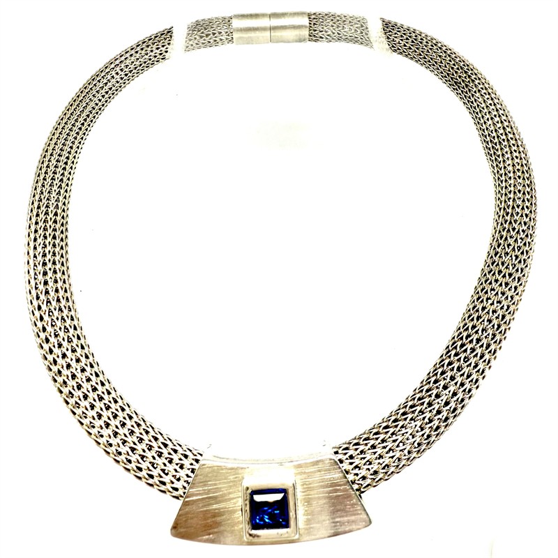 Designový náhrdelník z masivního stříbra. Šperk byl vyroben ze stříbra sterlingové ryzosti 925/1000, o celkové váze 62,40 g. Tvoří jej splétaný řetízek o průměru 9 mm ozdobený odnímatelným závěsem s ostře modrým spinelem, Nevšední, rafinované zapínání. Délka 45,5 cm. Perfektní stav.
