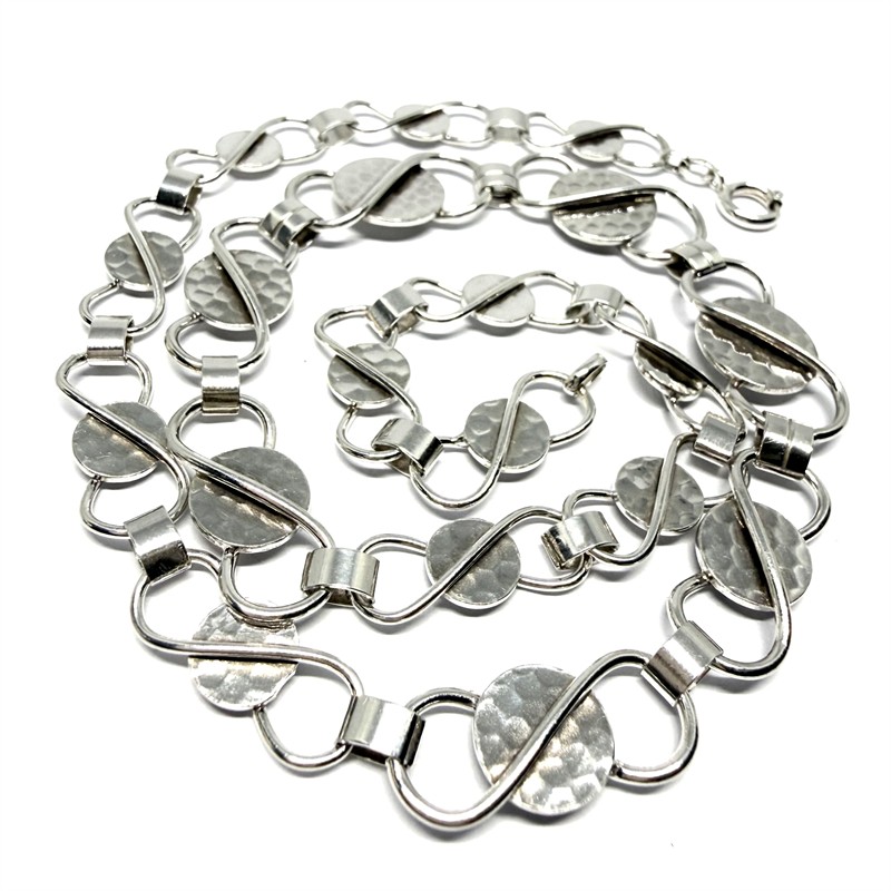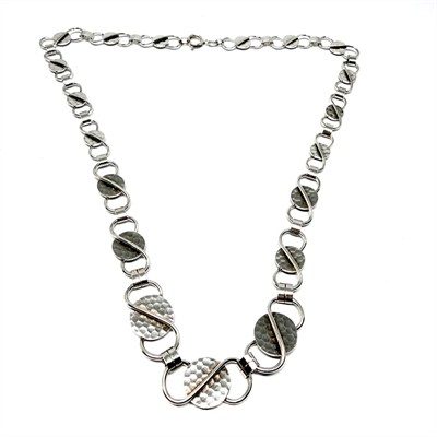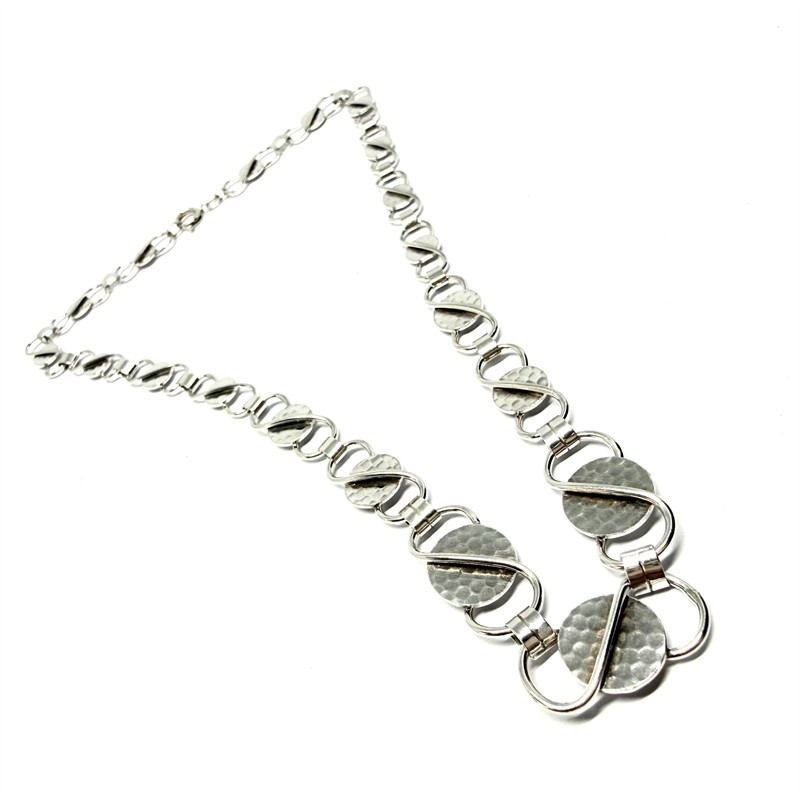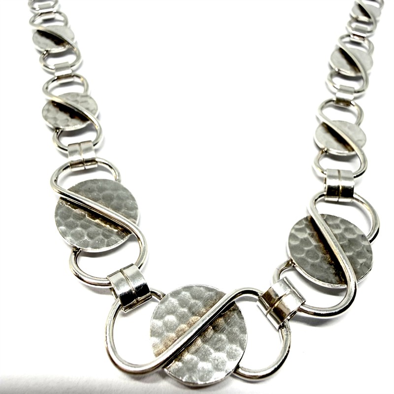 Nadčasový, designový, článkový náhrdelník. Šperk byl zhotoven koncem 1. poloviny 20.století ze stříbra ryzosti 835/1000. Váha šperku 24,31 g. Délka 45 cm. Šperk je tvořen geometrickými články na středu zdobenými intenzivním tepáním. Články se směrem ke středu zvětšují. Šperk byl profesionálně vyčištěn. Perfektní stav.