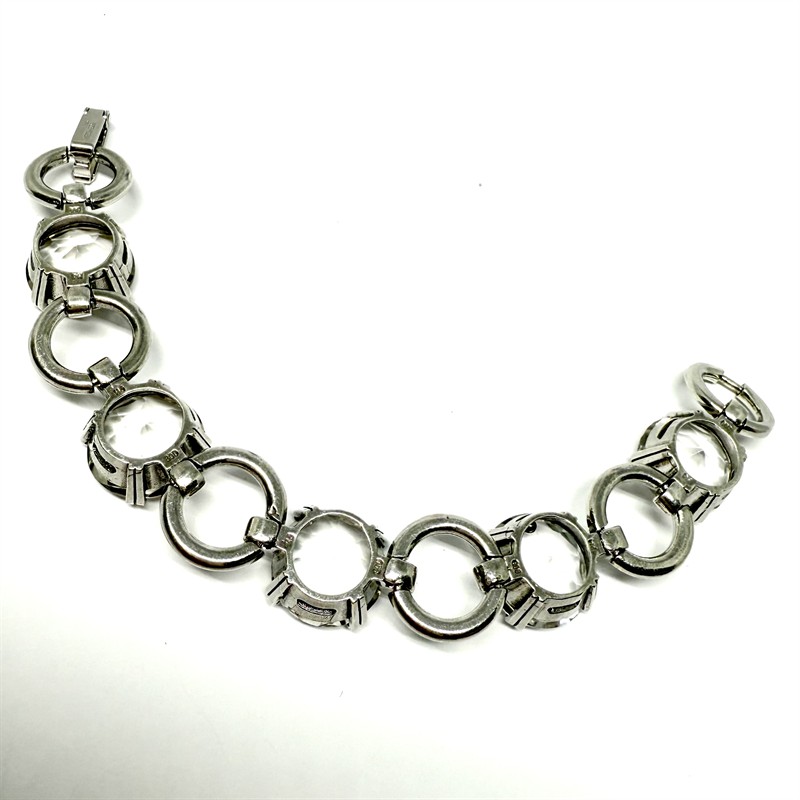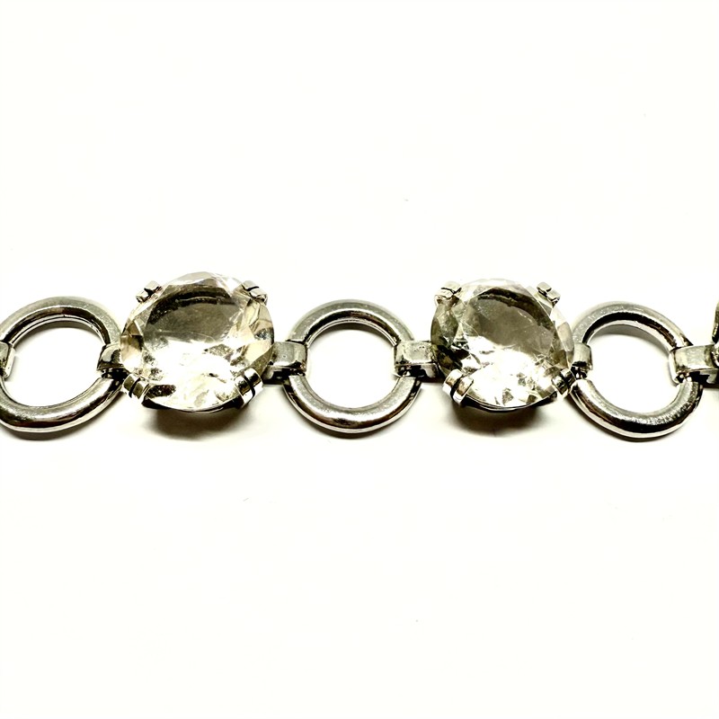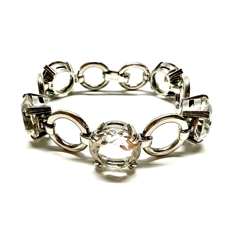 Výrazný, designový náramek ze stříbra. Šperk zdobí pět větších horských křišťálů. Náramek byl vyroben ze stříbra ryzosti 835/1000, o celkové váze 36,30 g. Délka 17 cm. Značeno ryzostní, autorskou a puncovní značkou. Perfektní stav.