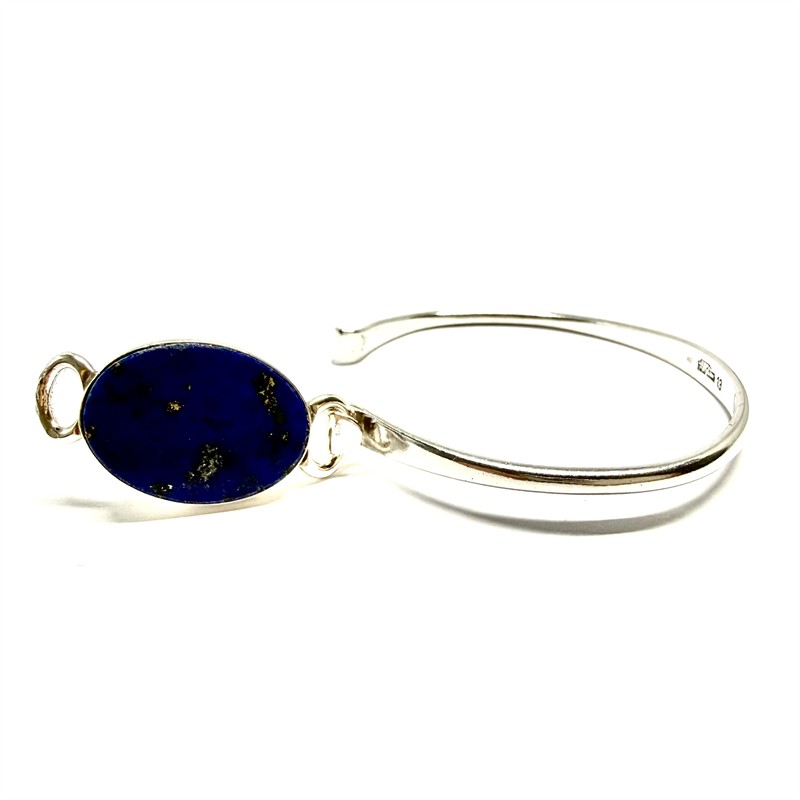 Nadčasový, minimalisticky ztvárněný, jemný náramek z dílny světově uznávaného dánského návrháře N. E. Froma. Šperk je osazen sytě modrým lápisem lazuli oválného tvaru. Rafinované zapínání. Šperk byl vyroben ze sterlingového stříbra (925/1000) a váží 11,08 g. Díky průměru 5,5 cm se hodí spíše na drobnější až normální ruku. Profesionálně vyleštěno, perfektní stav. Signováno, číslováno.
