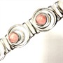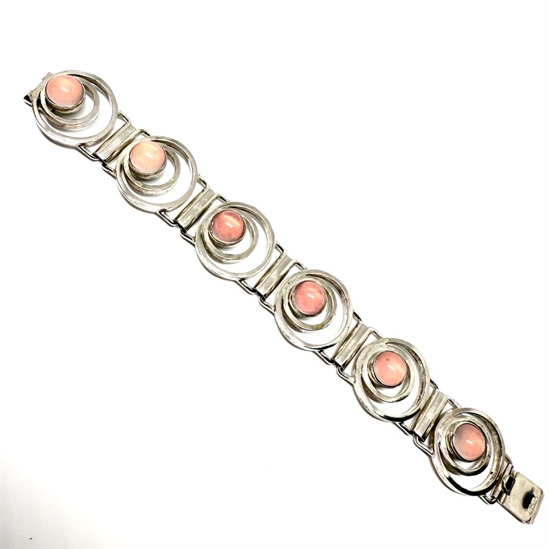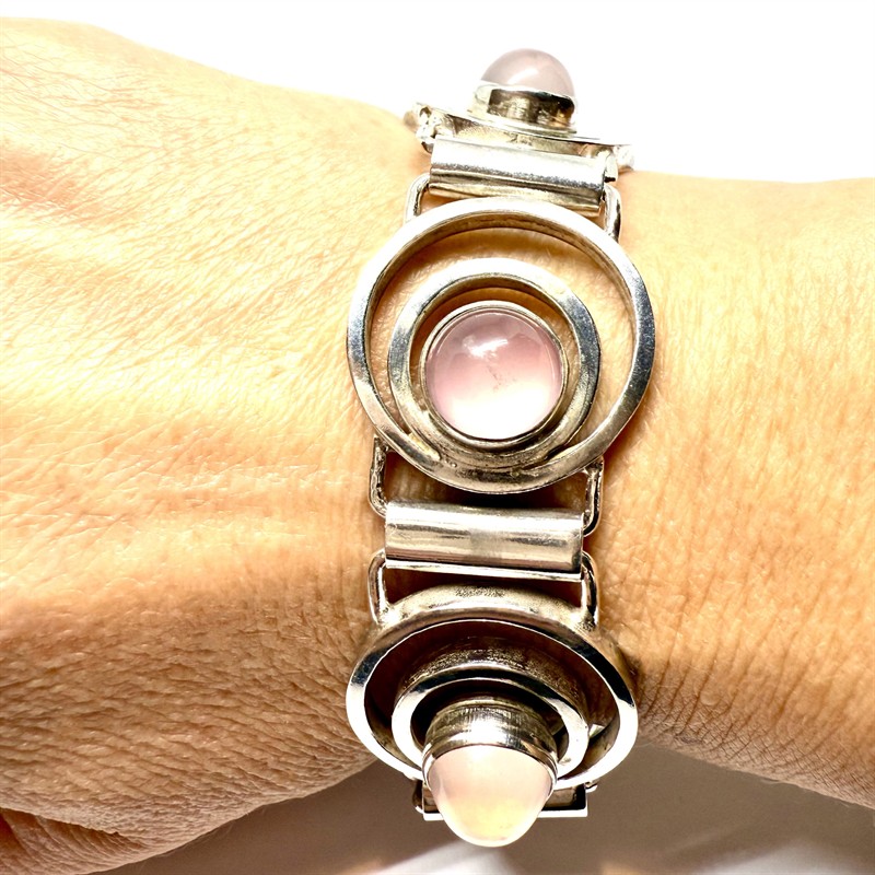 Výrazný, efektní designový náramek z masivního stříbra. Ryzost 835/1000, celková váha 57,64 g. Každý z článků je osazen růženínem kabošonového brusu. Značeno mistrovskou, puncovní a ryzostní značkou. Délka 18 cm, šířka 2,3 cm. Čištěno, perfektní stav.