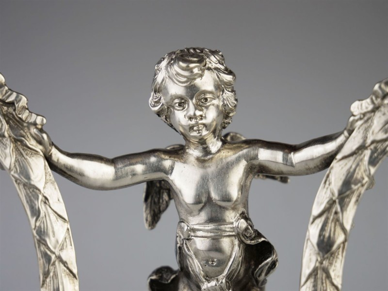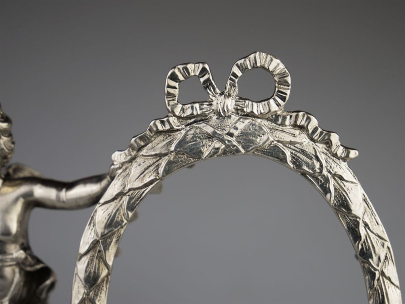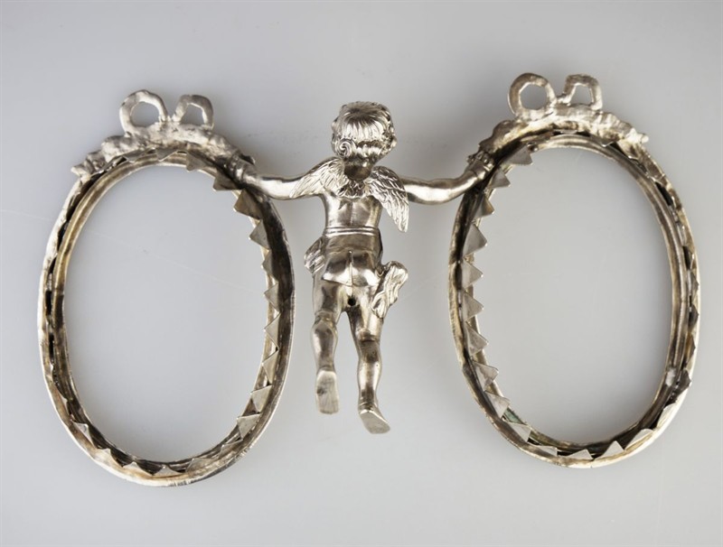 neoklasicistní stříbrný dvojrámeček se soškou amorka, Ag 161,80 g/800/1000, západní Evropa, kolem r. 1890; rozměry 18 x 10,8 cm; atest Puncovního úřadu