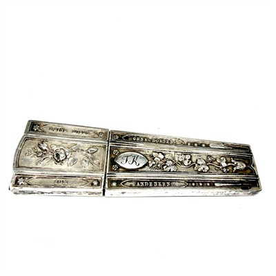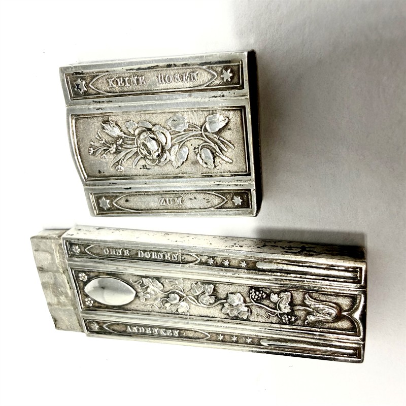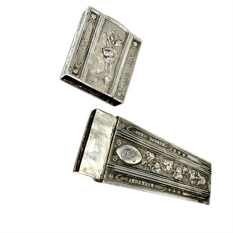 Malebný, velmi starý box sloužící k uskladněný jehel. Artefakt byl vyroben počátkem 2. poloviny 19.století ze stříbra netradiční ryzosti 850/1000. Váha 21,58 g. Zdobeno plastickým motivem růží a vinné révy. Rozměry cca 8 x 2,5 cm. Výborný stav.