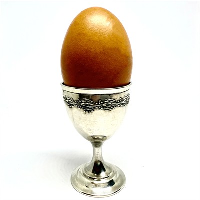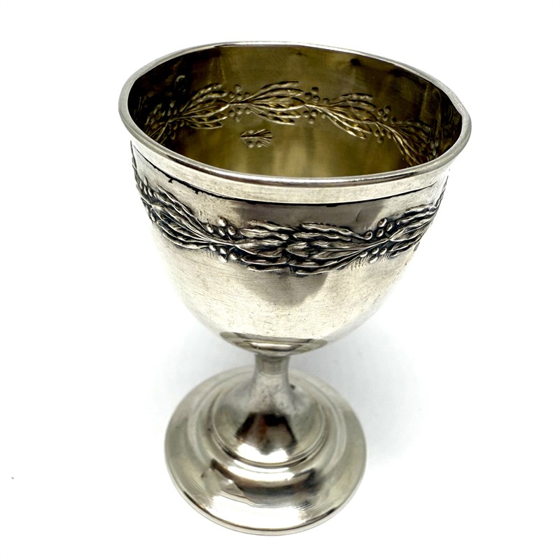 Půvabný, stříbrný kalíšek na vajíčko z konce 19.století. Artefakt zhotovený z neobvyklé ryzosti témeř ryzího stříbra 950/1000, hmotnost 15,91 g. Osvědčení Puncovního úřadu. Značeno na dvou místech mistrovskou značkou. Výška 6,8 cm. Velmi dobrý stav.