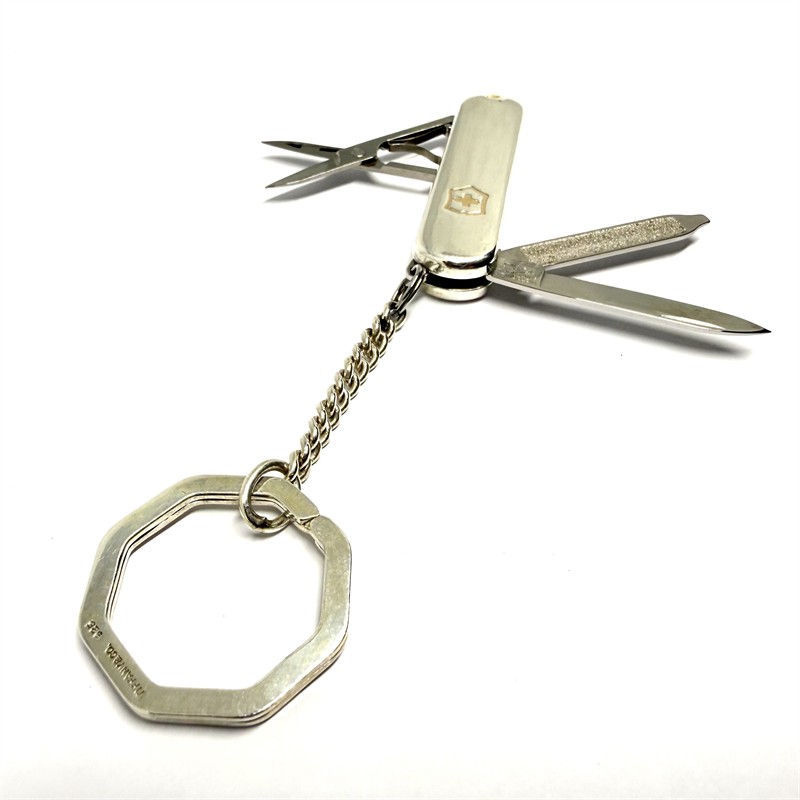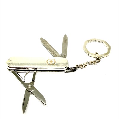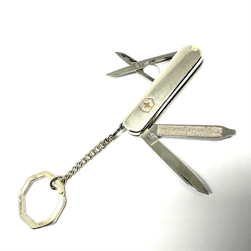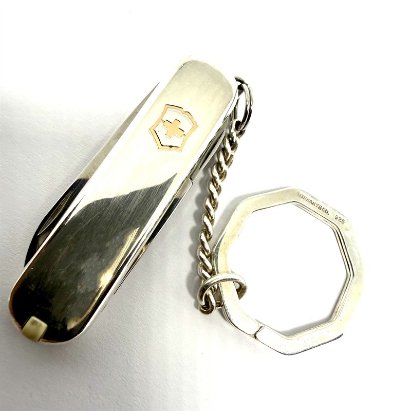Unikátní, stříbrný kapesný nožík Victorinox zhotovený ve spolupráci s legendárním šperkařským domem Tiffany & Co.. Pouzdro nože bylo zhotoveno ze sterlingového stříbra (925/1000), znak Victorinox zlato 18K (750/1000) - obě ryzosti značeny na pouzdru nože. Užitné části vyrobeny z oceli. Celková váha 53,50 g. Rozměry 5,8 x 1,3 cm bez závěsného řetízku. Značeno. Perfektní stav.