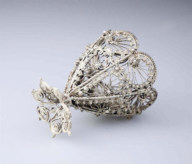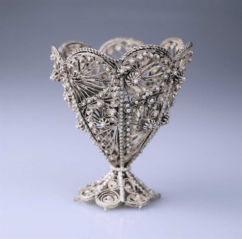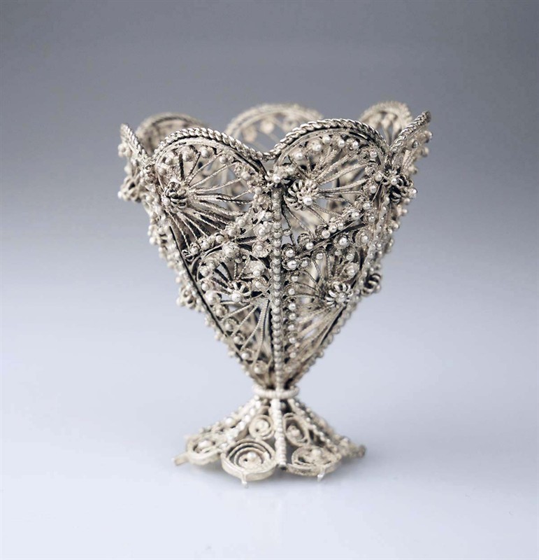stříbrný košíček ručně tažený z drátu s mistrovskými filigrány, granulací, radiální květinové rozety, typická práce ze slavného období balkánských stříbrníků se silným osmanským vlivem, konec 19. století, Ag 30,39 g/925/1000, osvědčení Puncovního úřadu, průměr 4,5 cm, výška 5,2 cm
