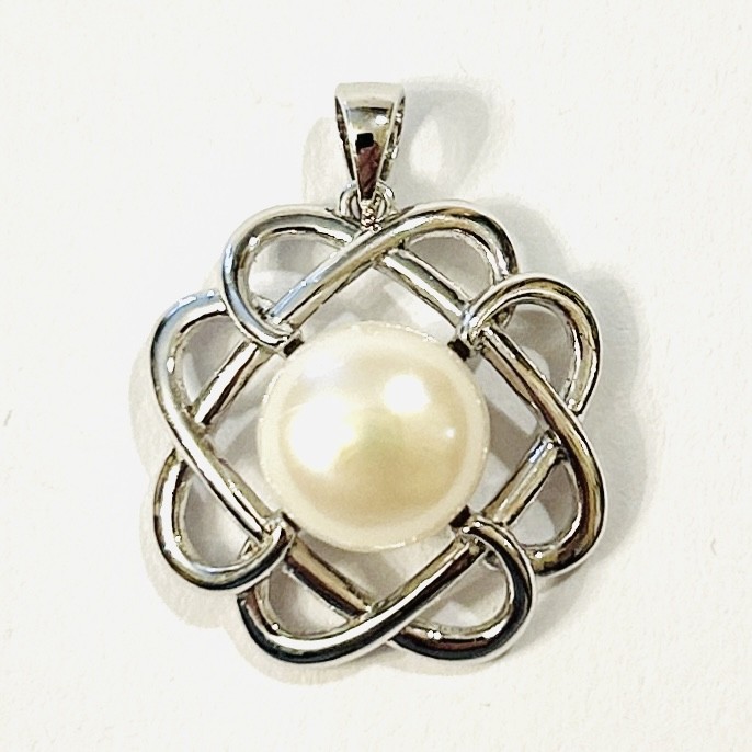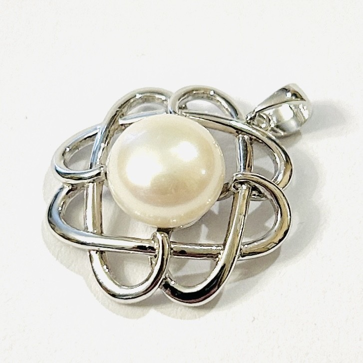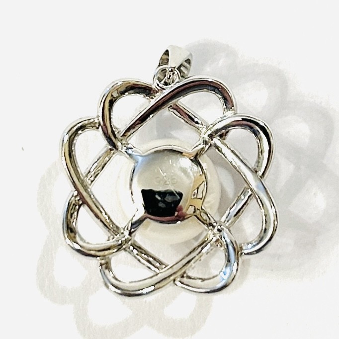Moderní, nový přívěšek ve tvaru spletitého květu, ve středu osazeno přírodní kultivovanou bílou perlou. Západoevropská zlatnická práce z 10. let 21. století. Zhotoveno z nezlaceného stříbra o ryzosti 925/1000; ryzostní číslo zezadu. Hmotnost 3,08 g, délka 24 mm, šířka 18 mm. Nikdy nenošeno, stav nový, tedy intaktní.
