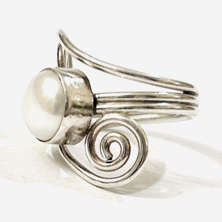 Výrazný, ornamentální moderní prsten osazený v plně přiléhající obrubě přírodní kultivovanou bílou perlou, jež se vyznačuje průměrem 11 mm a zploštěním, tělo prstenu z linií silného drátu s protilehlými volutami. Kvalitní ruční evropská zlatnická práce z počátku 21. století. Zhotoveno z nezlaceného stříbra o ryzosti 925/1000; punc S-61 (kozlík 2) zevnitř šíny. Hmotnost 8,29 g, velikost 62, délka hlavice 26 mm. Ve velmi zachovalém stavu, odborně vyčištěno a vyleštěno.