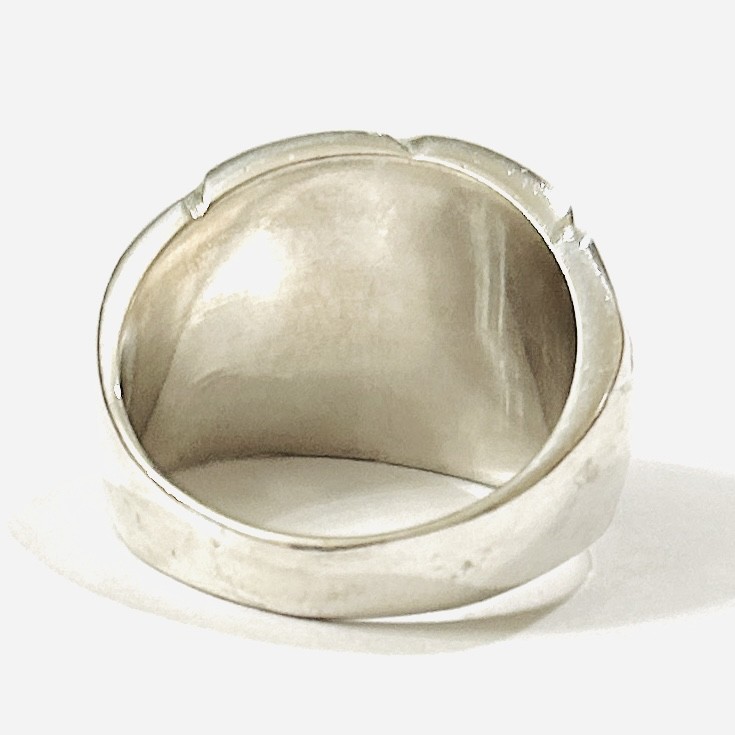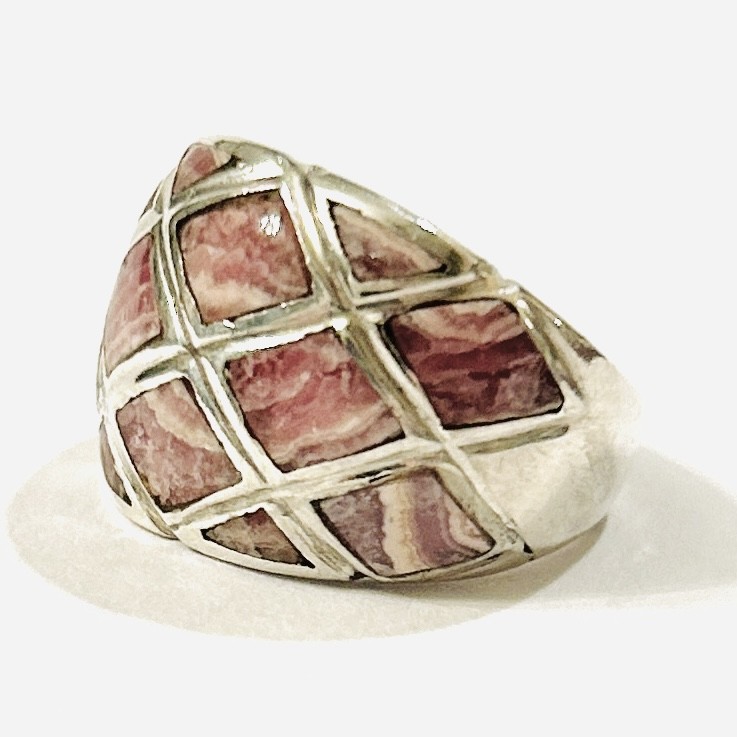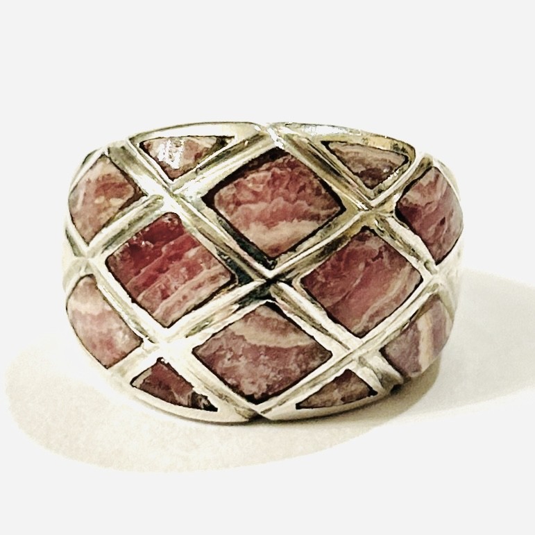 Masivnější, moderně pojatý prsten vykládaný leštěnými přírodními rodonity, solidní, patrně mimoevropská práce z konce 20. století. Zhotoveno z nezlaceného stříbra o ryzosti 925/1000; nově opatřeno puncem S-61 (kozlík 2) a stornované ryzostní číslo zevnitř šíny. Hmotnost 6,95 g, velikost 54, šířka 15 mm. V zachovalém stavu, odborně vyčištěno a vyleštěno zlatníkem.