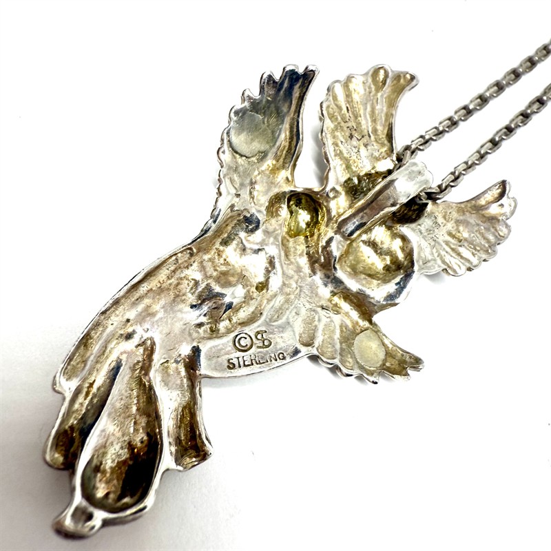 Půvabný, stříbrný náhrdelník s odnímatelným, velkým závěsem. Ten znázorňuje dva, plasticky ztvárněné anděly. Sterlingové stříbro (925/1000). Celková váha 14,04 g. Délka řetízku 45 cm, rozměry závěsu cca 5 x 3 cm. Ryzostní, autorská a puncovní značka. Výborný stav.
