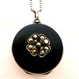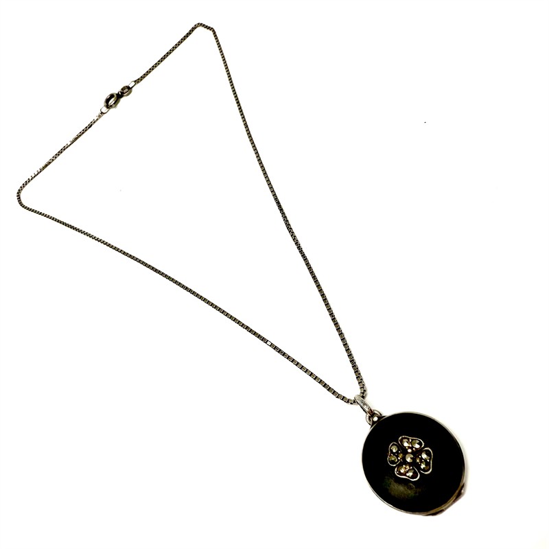 Půvabný, stříbrný náhrdelník s odnímatelným závěsem - medailonem. Šperk zdobí jemně matovaný černý smalt s kontrastním, plasticky vyvedeným čtyřlístkem. Ten zdobí lesklé markazity. Stříbro ryzosti 935/1000, řetízek o délce 41 cm ze sterlingového stříbra (925/1000). Celková váha 8,57 g. Starý, autentický šperk ve výborném stavu.