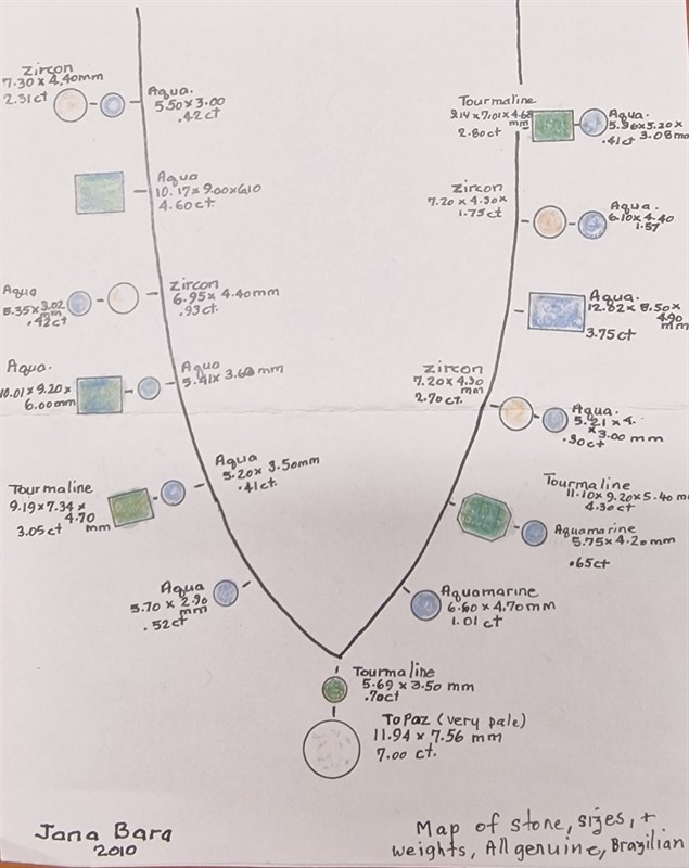 Zajímavý náhrdelník s přírodními brazilskými kameny - akvamaríny, turmalíny, topazy. Stříbrno ryzosti 925/1000, délka náhrdelníku 46 cm. V příloze schéma rozmístění kamenů.