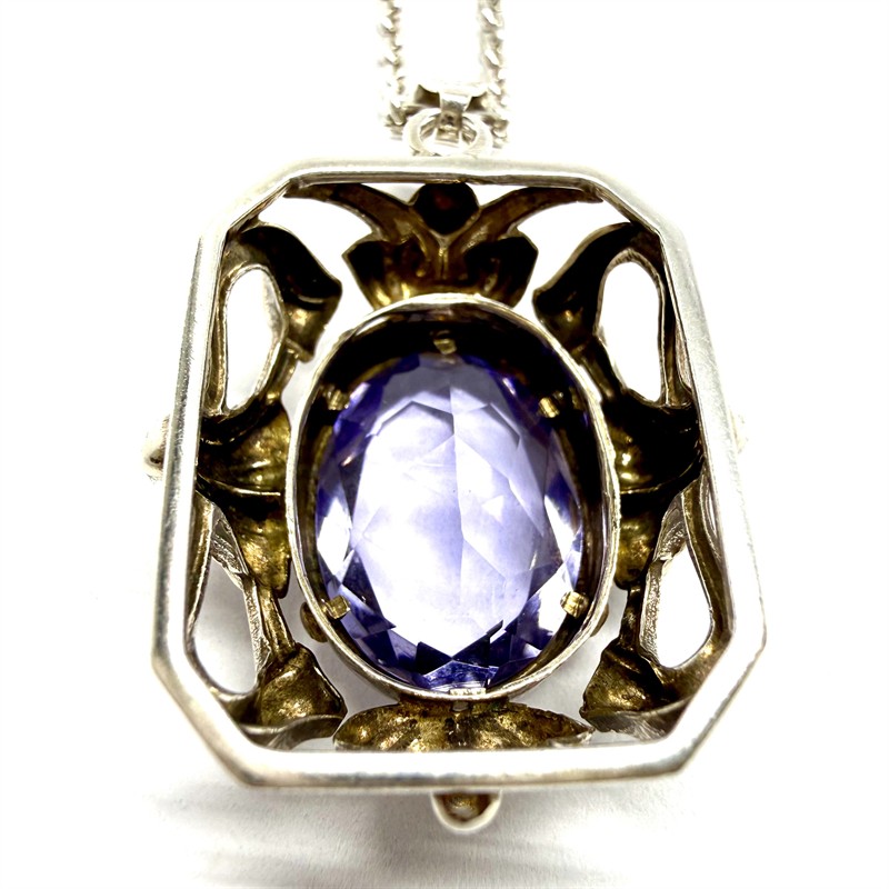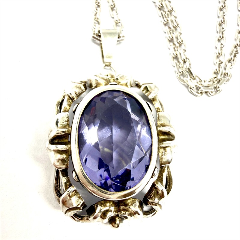 Dlouhý, elegantní stříbrný náhrdelník - masivnější řetízek s odnímatelným závěsem. Ten byl vyroben v první polovině 20.století ze stříbra ryzosti 835/1000. Šperk zdobí oválný, sytě fialový ametyst fazetového brusu. Celková váha šperku 15,84 g. Délka řetízku 54 cm. Rozměry závěsu bez závěsného očka 2 x 2,7 cm. Šperk byl profesionálně vyčištěn a je v perfektním stavu.