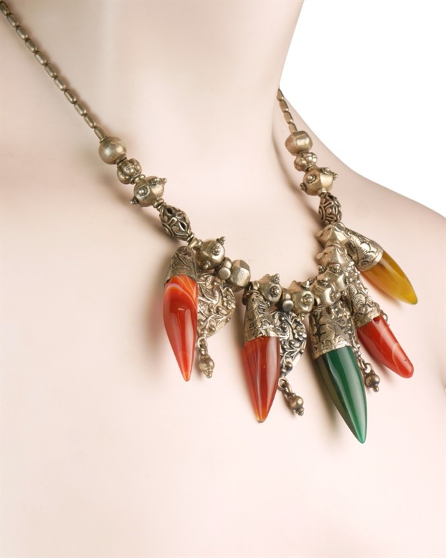 Velmi zajímavý šperky - výrazný náhrdelník ze stříbra ryzosti 925/1000 s pěti ověsy zdobenými achátem, chrysoprasem a jaspisy. Celková hmotnost náhrdelníku 78,03 g, délka 47 cm.