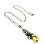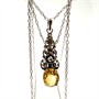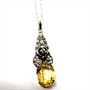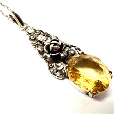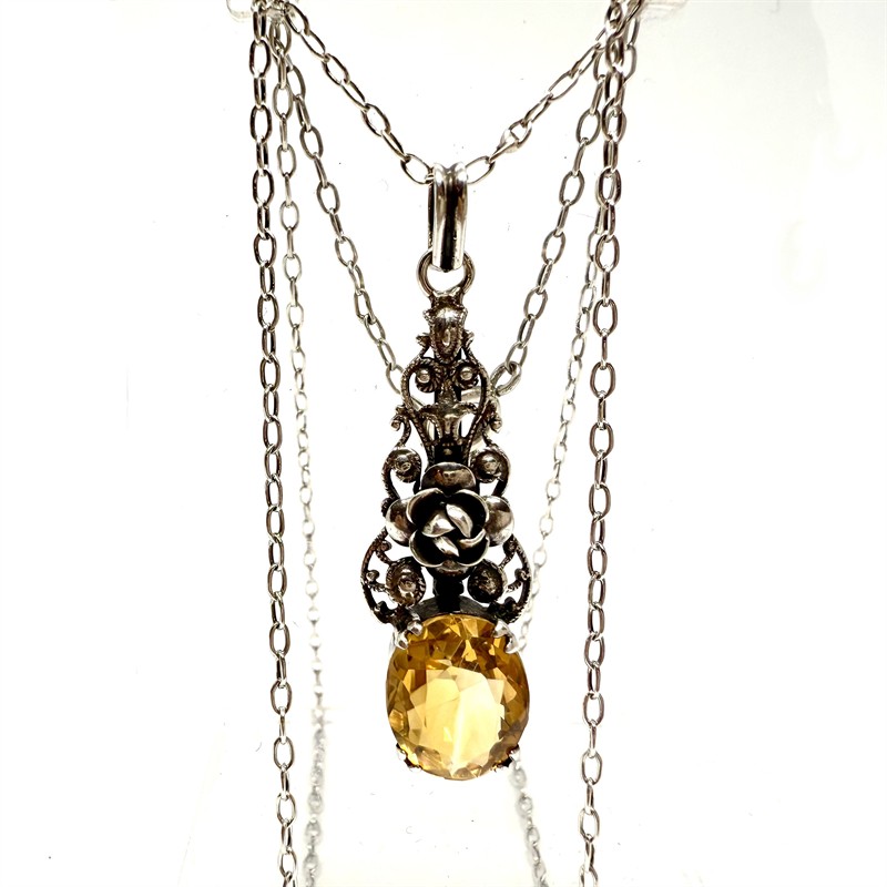 Malebný, stříbrný náhrdelník s odnímatelným závěsem nesoucí motiv růže. Šperk zdobí fazetově broušený citrín, sytého žlutého odstínu. Šperk byl zhotoven ze stříbra ryzosti 900/1000, o celkové váze 4,28 g. Délka řetízku 47 cm. Profesionálně vyčištěno zlatníkem, výborný stav.