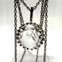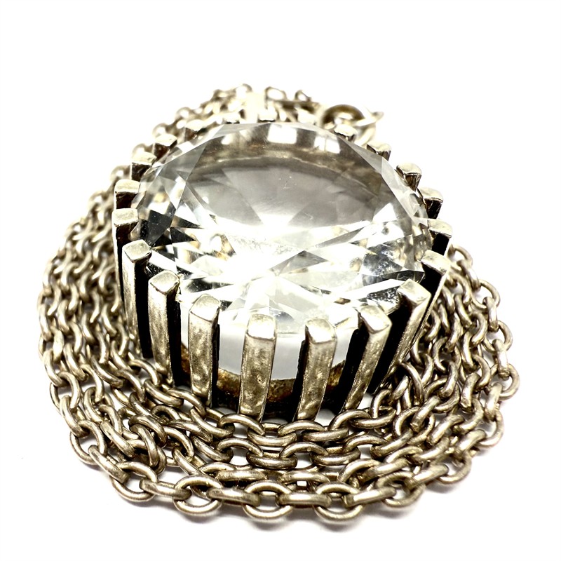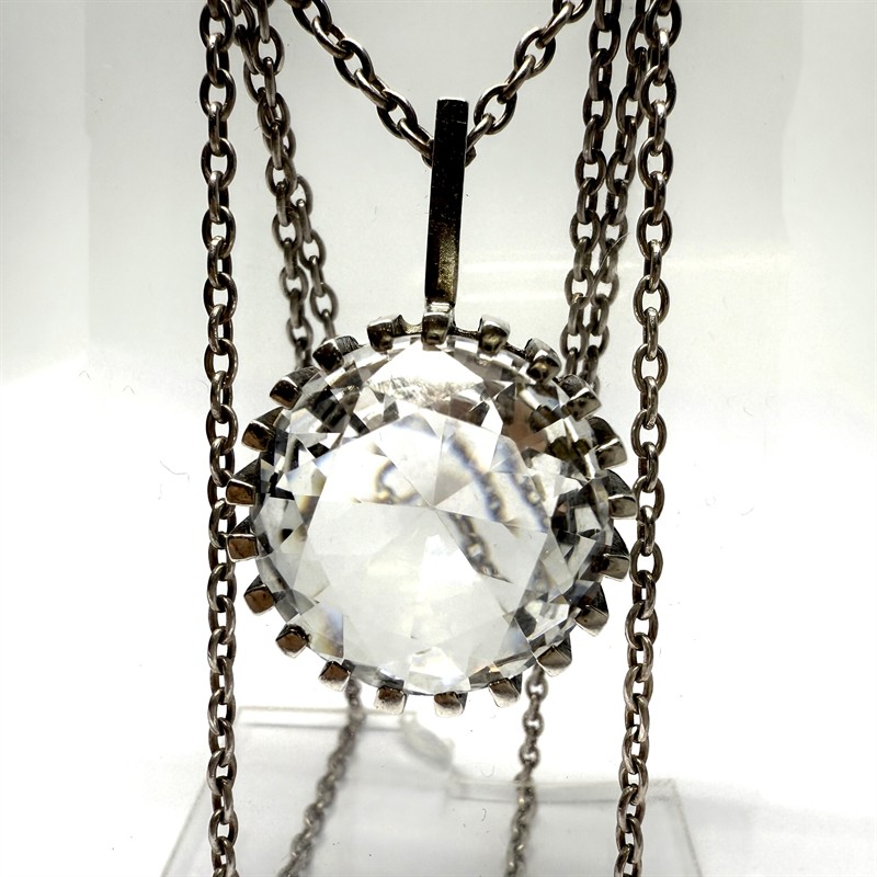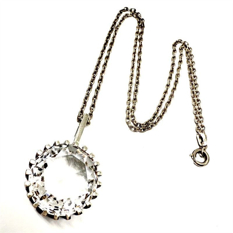 Stříbrný náhrdelník - řetízek zdobený nadčasovým odnímatelným závěsem. Tomu dominuje velký horský křišťál fazetového brusu, kulatého tvaru. Závěs byl zhotoven ze sterlingového stříbra (925/1000). Řetízek délky 50 cm stříbro ryzosti 835/1000. Celková váha 16,99 g. Šperk je označen puncovní, ryzostní a autorskou značkou. Perfektní stav.