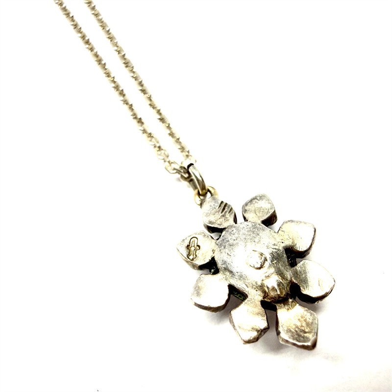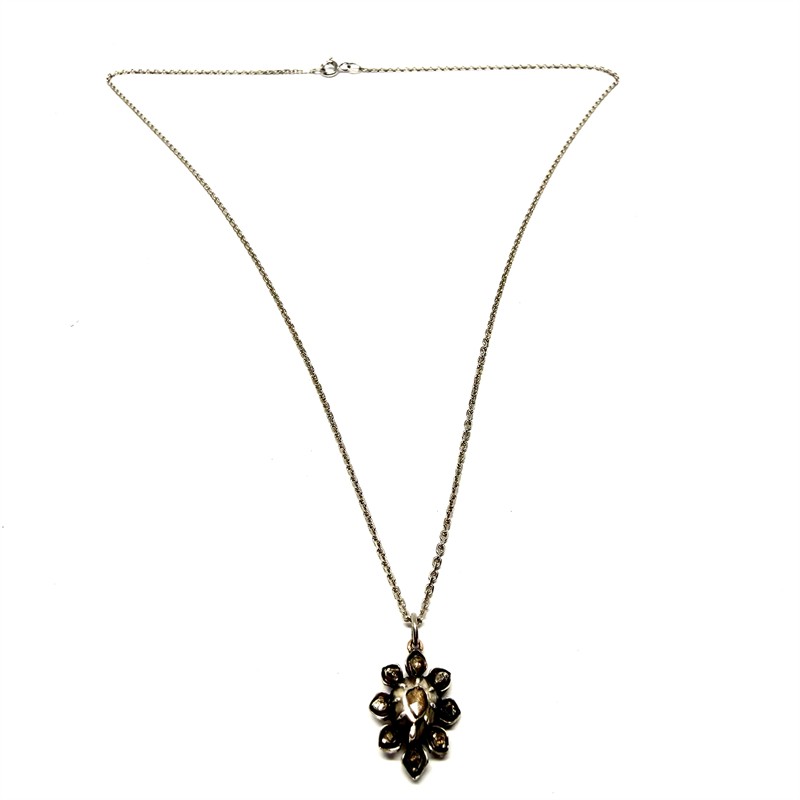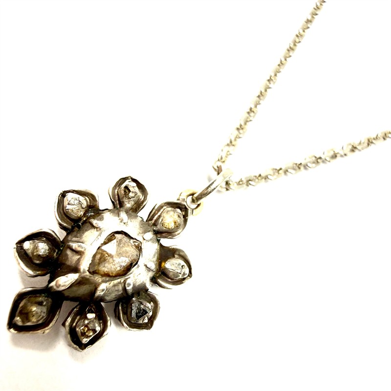 Velmi starý, půvabný náhrdelník ze stříbra, odnímatelný závěs ve tvaru květu. Závěs zdobí velká centrální diamantová routa, tu rámuje osm menších diamantových rout. Sterlingové stříbro (925/1000). Váha šperku 3,80 g. Délka řetízku 46 cm. Rozměry závěsu cca 2 x 1 cm. Perfektní stav.