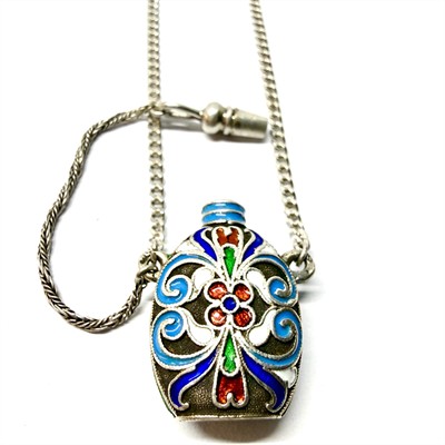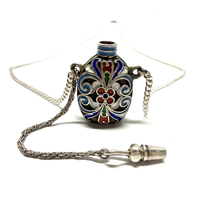 Stříbrný náhrdelník s flakonem zdobeným smalty