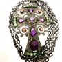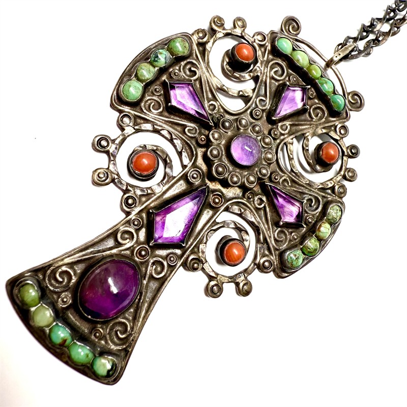 Originální, mexický stříbrný náhrdelník. Šperku vévodí grandiózní, plasticky zdobený kříž, bohatě osázený drahými kameny. Jedná se o ametysty, tyrkysy a korály. Šperk byl vyroben ze sterlingového stříbra (925/1000), o celkové váze 25,80 g. Délka řetízku 71 cm, rozměry kříže 7,2 x 4,7 cm. Šperk je perfektně zachovalý a byl ponechán v původním, autentickém stavu.