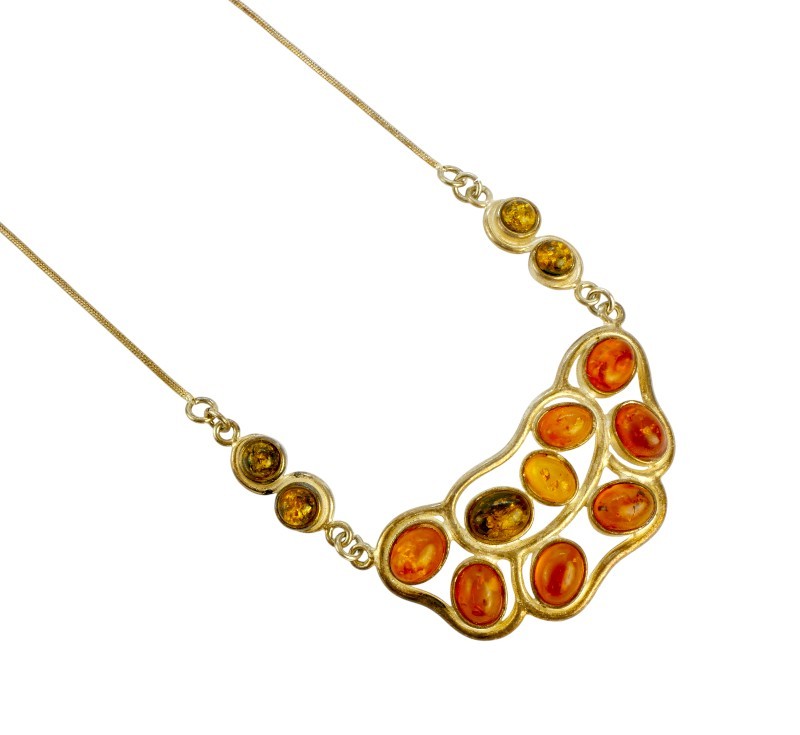 Náhrdelník ze stříbra ryzosti 925/1000 s jantary. Celková hmotnost šperku je 14,80 g. Délka řetízku je 46 cm.