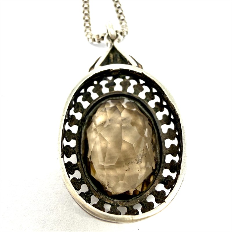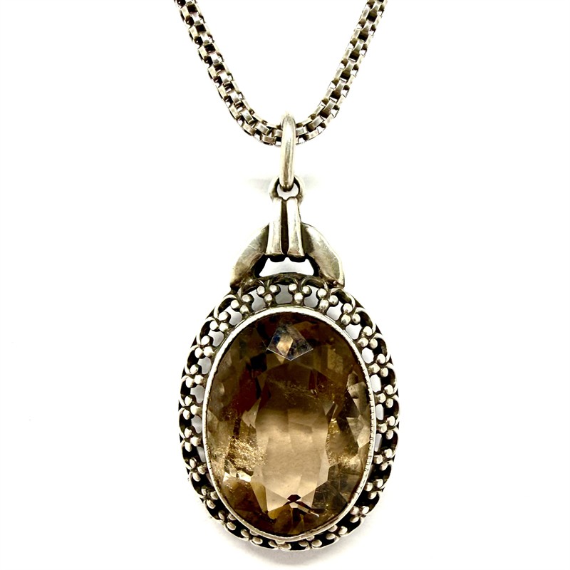 Půvabný, dlouhý, prvorepublikový náhrdelník. Nevšední řetízek zdobí odnímatelný závěs osazený velkým, fazetově broušeným, kouřovým topazem. Šperk byl zhotoven ze stříbra ryzosti 800/1000 v první polovině 20.století. Řetízek délky 61 cm ze sterlingového stříbra (925/1000). Celková váha šperku 10,15 g.