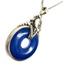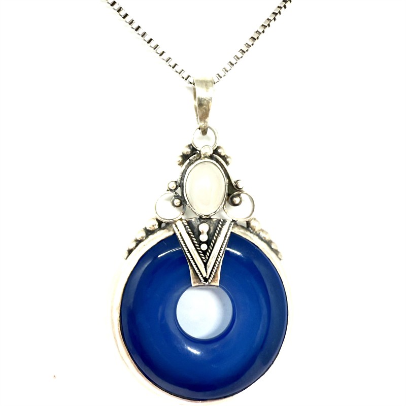 Půvabný, stříbrný náhrdelník - řetízek typu kostka s odnímatelným závěsem. Tomu vévodí velký modrý chalcedon a drobný šedý chalcedon. Šperk byl zhotoven ze sterlingového stříbra (925/1000), o celkové váze 13,23 g. Délka řetízku 42 cm, rozměry závěsu 4,7 x 2,5 cm. Výborný stav.