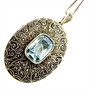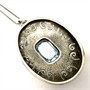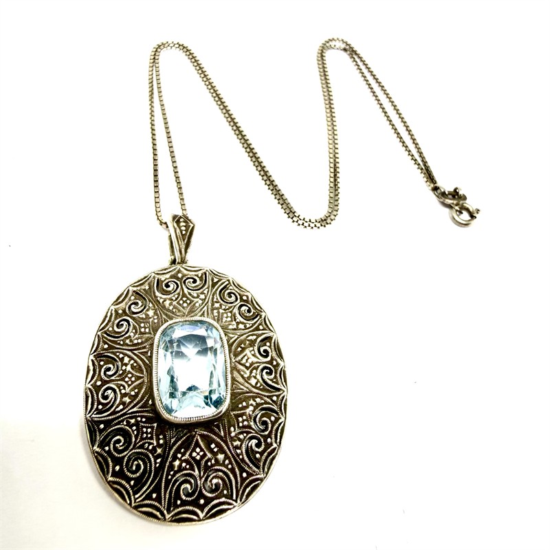 Půvabný, stříbrný náhrdelník - jemný řetízek zdobený odnímatelným, prvorepublikovým závěsem oválného tvaru. Šperk byl vyroben ze stříbra ryzosti 835/1000, je osazen ocelově modrým spinelem a velmi jemně, detailně zdobený. Řetízek je dlouhý 42 cm a byl zhotoven ze sterlingového stříbra (925/1000). Celková váha šperku 10,34 g. Rozměry závěsu cca 3,5 x 2,5 (BEZ závěsného očka). Perfektní stav.