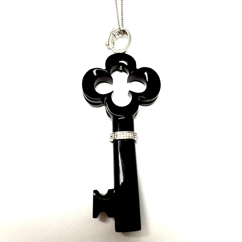 Půvabný stříbrný náhrdelník - jemný řetízek, který zdobí větší odnímatelný závěs ve tvaru klíče. Šperk byl zhotoven z obsidiánu a zdobí jej komponenty ze sterlingového stříbra (925/1000). Celková váha 7,24 g. Rozměry závěsu cca 6 x 2 cm. Délka řetízku 49 cm. Díky rozevíratelnému, závěsnému očku může být závěs nošen i na tlustém řetízku, korálcích, či perlách. Perfektní stav.