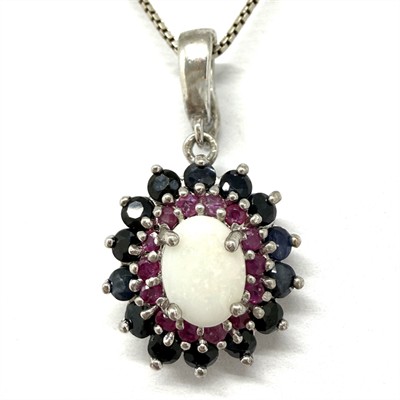 Půvabný stříbrný náhrdelník - řetízek typu kostka s odnímatelným závěsem bohatě zdobeným drahými kameny. Šperk byl vyroben ze stříbra sterlingové ryzosti (925/1000), o celkové váze 6,18 g. Závěs je osazen oválným opálem, které rámuje mezikruží drobných rubínu. Kontrastně dozdobeno tmavě modrými safíry. Drahé kameny jsou přírodního původu. Šperk disponuje velkým, rozevíratelným očkem, díky němuž lze zavěsit i na náhrdelník z drahých kamenů. Délka řetízku 45 cm. Výborný stav.