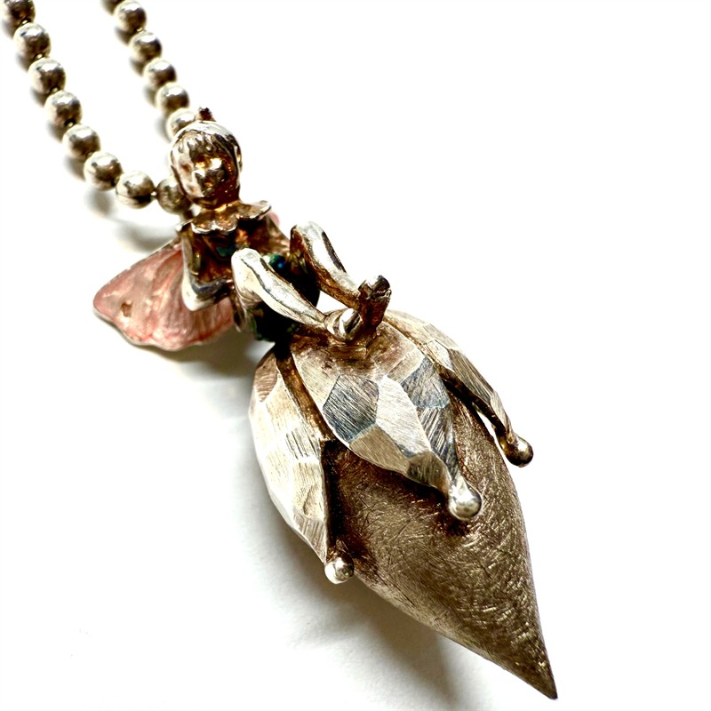 Velmi půvabný, autorský náhrdelník ze stříbra. Šperk zdobí odnímatelný závěs se sedící vílou. Náhrdelník byl vyroben ze sterlingového stříbra (925/1000), o celkové váze 16,54 g. Křídla víly zdobí jemně růžový smalt. Délka řetízku 45 cm. Závěs 3,5 cm. Originální, nevšední šperk v perfektním stavu.