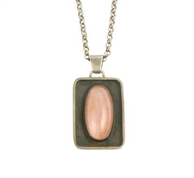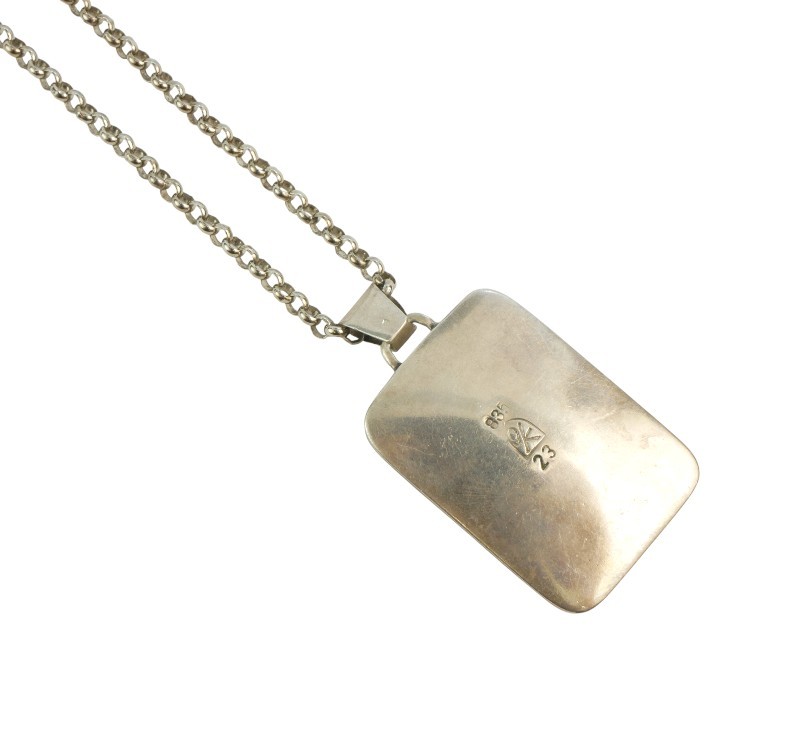 Výrazný, designový, náhrdelník z dílny šperkového designéra Georga Kramera. Šperk byl vyroben ze stříbra ryzosti 835/1000. Náhrdelník zdobí nádherný růženín broušený do kabošonu. Rozměr přívěsku s ouškem 5,4 x 2,7 cm. Délka řetízku 68 cm. Značeno autorskou značkou, a puncovní značka. Originální, nepřehlédnutelný šperk ve výborném stavu.