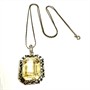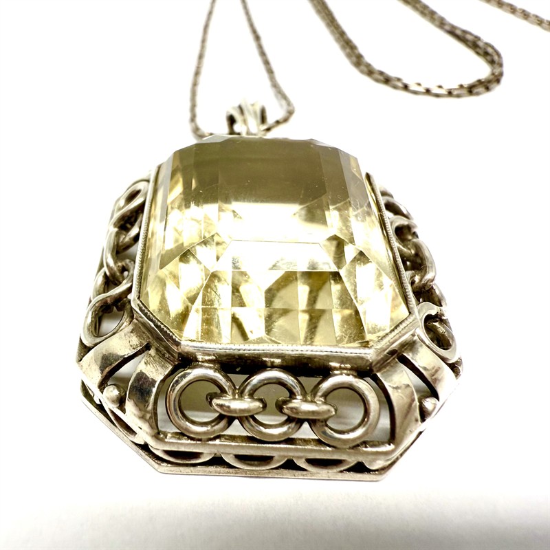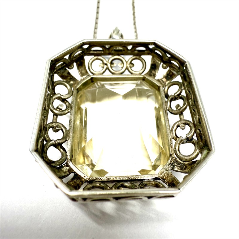 Půvabný náhrdelník zdobený výrazným odnímatelným závěsem. Šperk byl vyroben ze stříbra ryzosti 835/1000 v první polovině 20.století. Rozměry závěsu bez závěsného očka 3 x 2,7 cm. Závěs je osazen velkým citrínem střední barevné sytosti. Řetízek o délce 59 cm je stejné ryzosti. Celková váha 18,54 g.Perfektní stav.