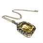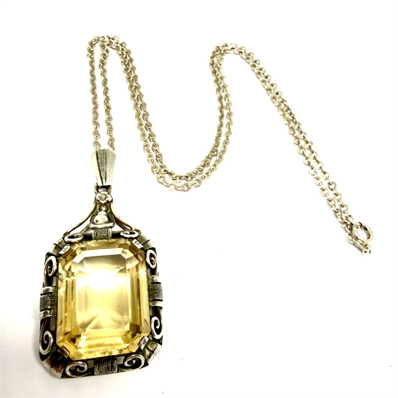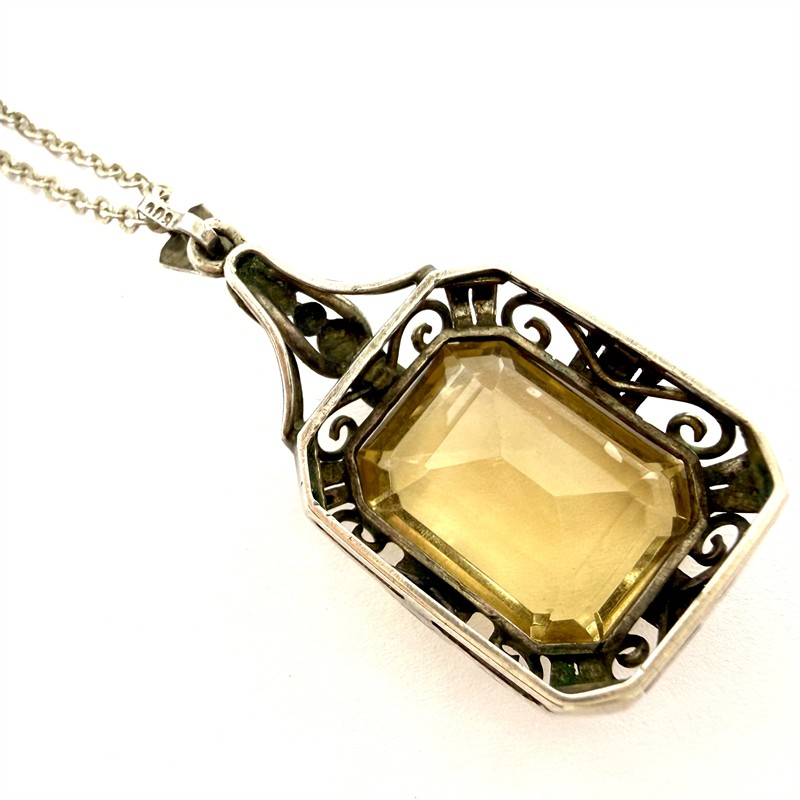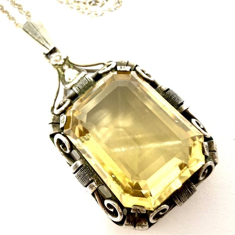 Půvabný, prvorepublikový šperk - řetízek zdobený větším závěsem jemuž dominuje fazetově broušený citrín střední barevné sytosti. Závěs byl zhotoven ze stříbra ryzosti 800/1000, řetízek stříbro ryzosti 835/1000. Celková váha 12,95 g. Délka řetízku 46 cm. Rozměry závěsu 2 x 4,5 cm. Starý, autentický šperk v perfektním stavu.