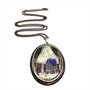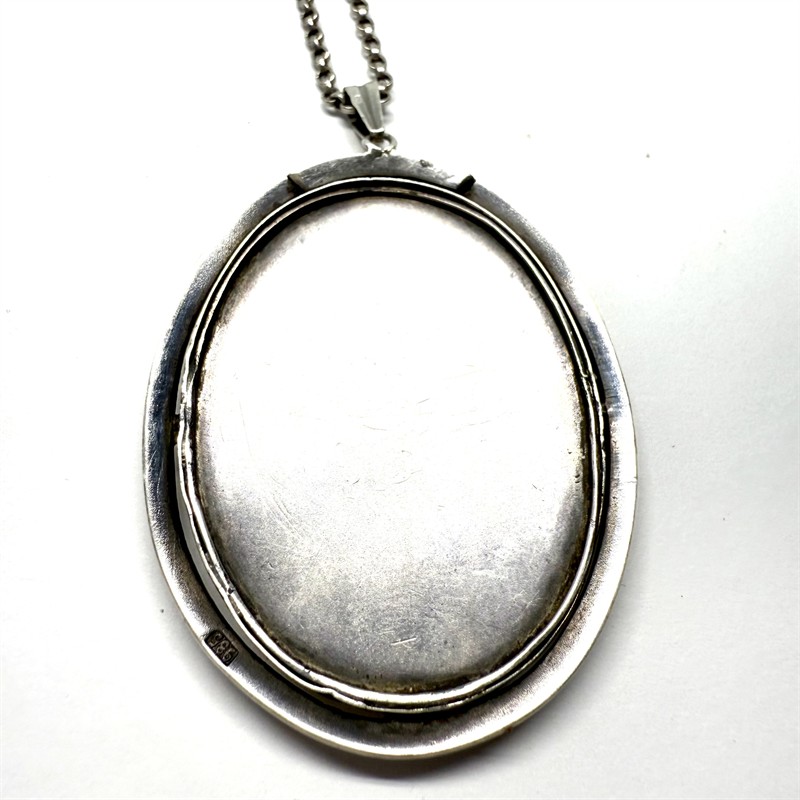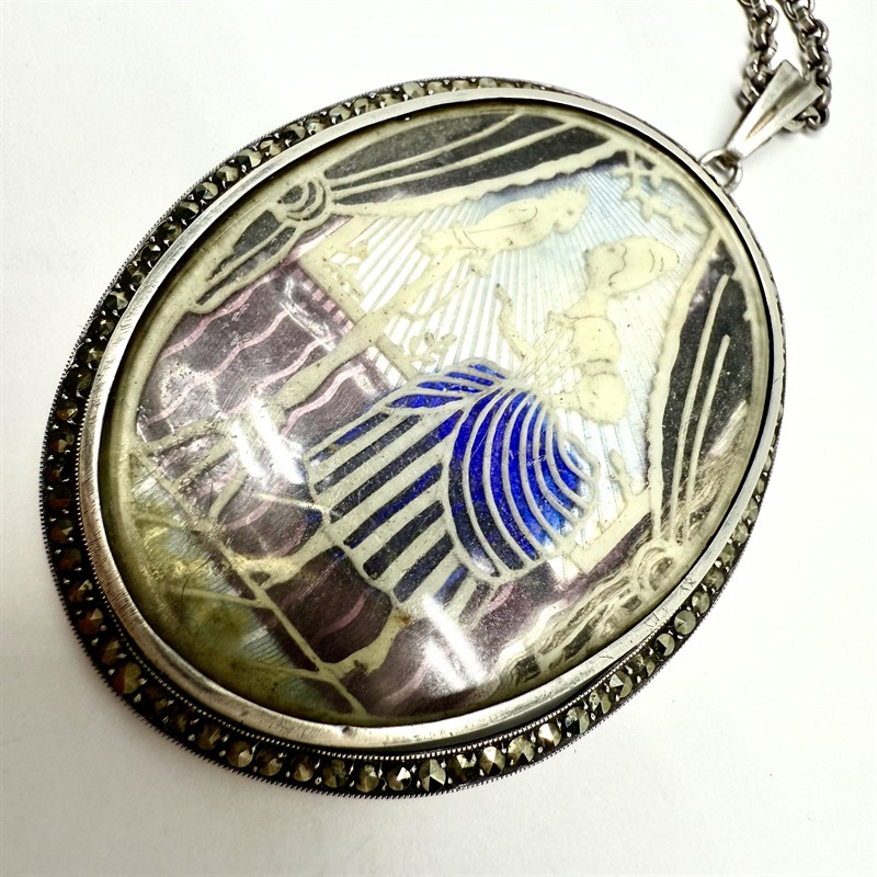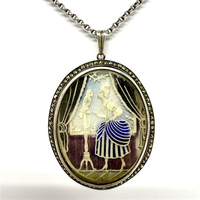 Nevšední stříbrný náhrdelník - delší řetízek s velkým, odnímatelným závěsem. Ten zdobí vyřezávaný plastický, rokokový motiv ženy krmící papouška. Orámováno elegantně se třpytícími markazity. Závěs byl zhotoven ze sterlingové stříbra (925/1000), řetízek o délce 67 cm ze stříbra ryzosti 835/1000. Celková váha 31,20 g. Závěs je většího rozměru cca 4 x 6 cm. Velmi dobrý stav.