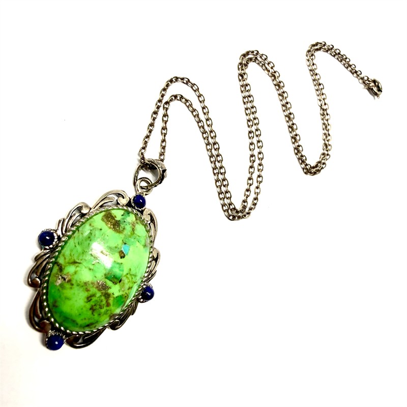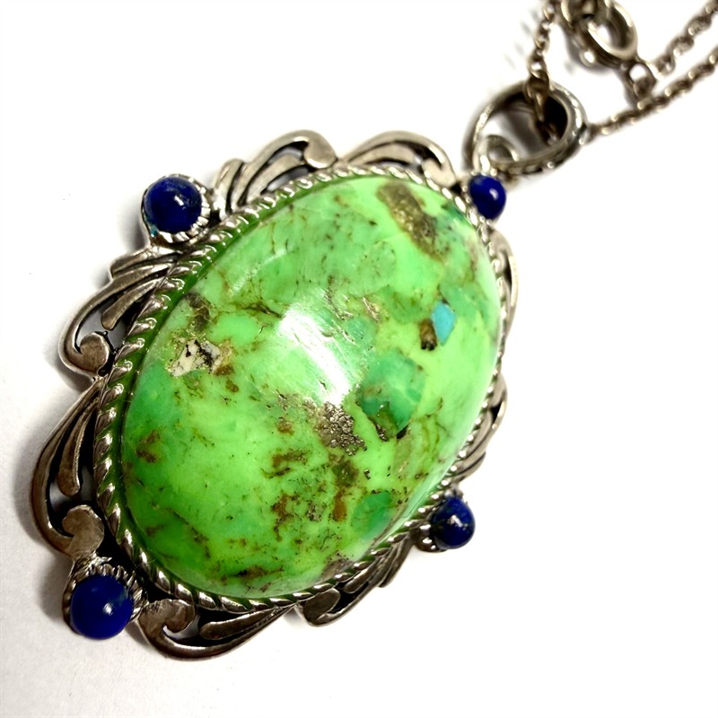 Nepřehlédnutelný, velmi půvabný náhrdelník. Řetízek s odnímatelným, větším závěsem. Ten byl zhotoven ze stříbra sterlingové ryzosti (925/1000). Závěsu dominuje sytě zelený kámen se zlatavými inkluzemi. Ten byl zasazen do zdobného rámu, jenž je osazen čtyřmi kuličkami lápisu lazuli. Řetízek délky 45 cm vyroben ze stříbra ryzosti 800/1000. Celková váha 11,48 g. Perfektní stav.