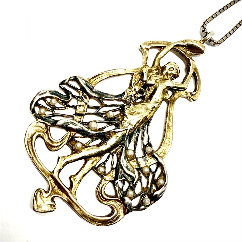 Půvabný stříbrný náhrdelník - řetízek zdobený velkým odnímatelným závěsem v secesním stylu. Šperk nese motiv ženské figury a zdobí jej drobné, bílé perly. Komplet byl zhotoven ze sterlingového stříbra (925/1000), o celkové váze 15,62 g. Délka řetízku 60 cm, rozměry závěsu 6 x 3,5 cm. Výborný stav.