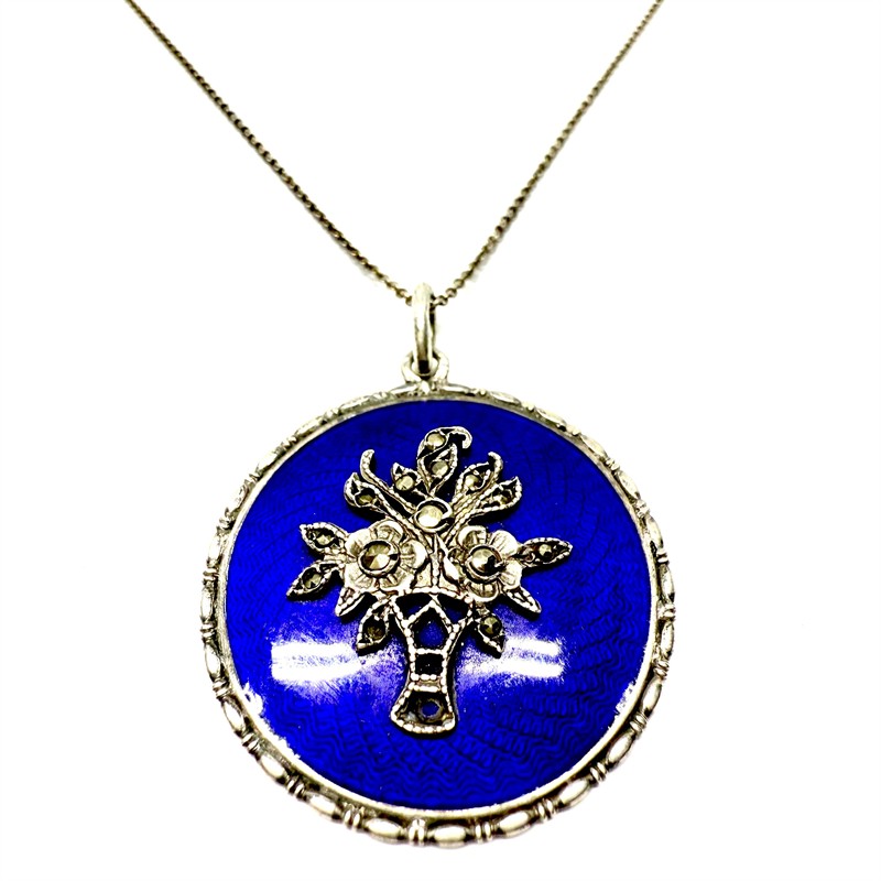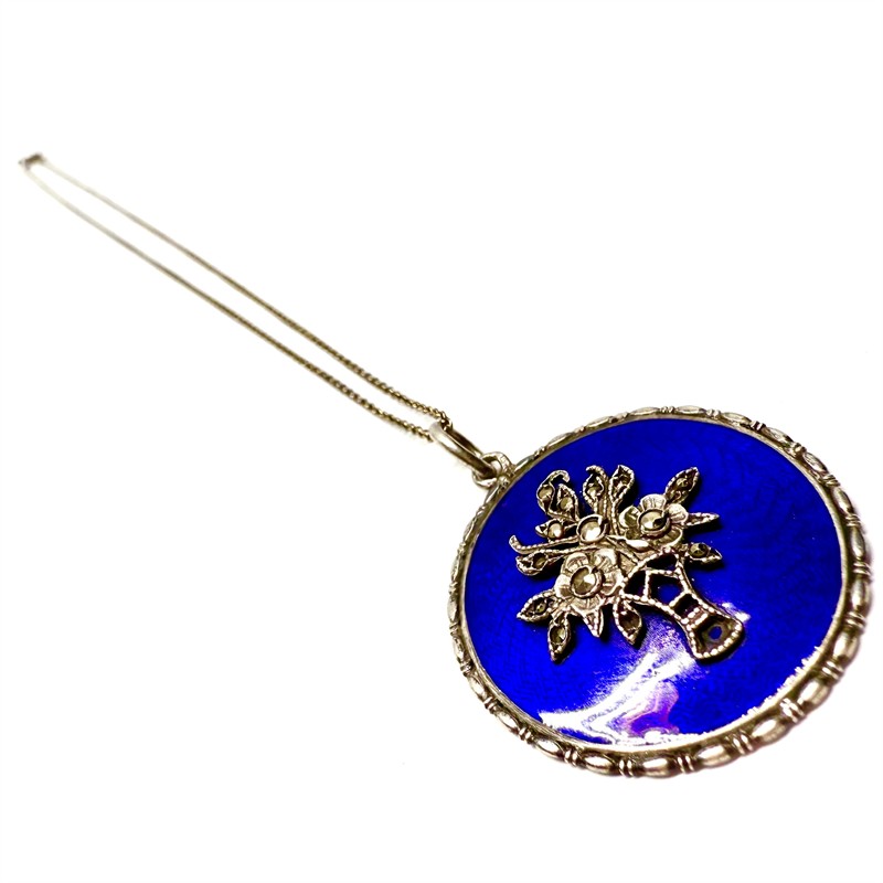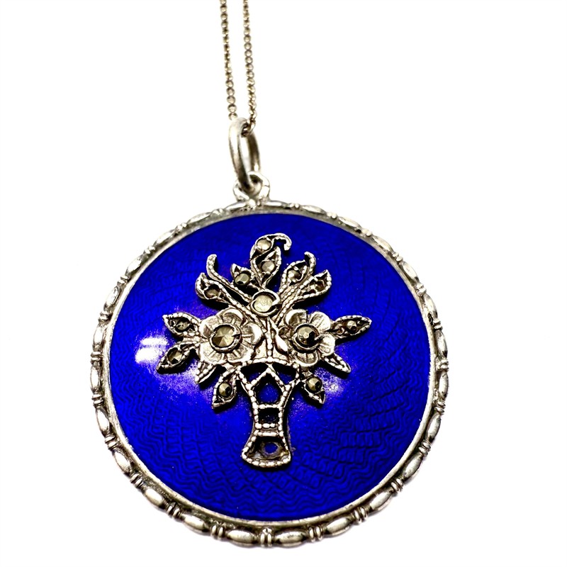Půvabný, stříbrný náhrdelník s odnímatelným závěsem. Šperk zdobí malebný, plasticky ztvárněný košíček osazený markazity a sytě modrý smalt v odstínu královská modř. Náhrdelník byl vyroben ze stříbra ryzosti 800/1000 a má průměr 2,5 cm. Řetízek o délce 43 cm má ryzost 835/1000. Celková váha 6,48 g.