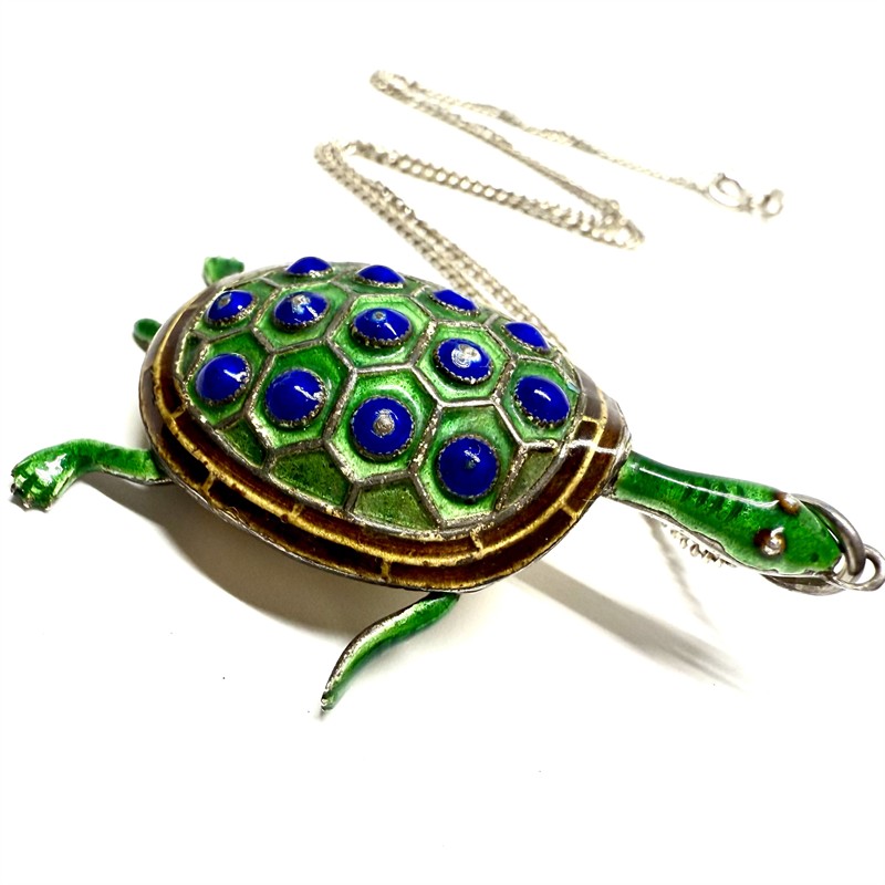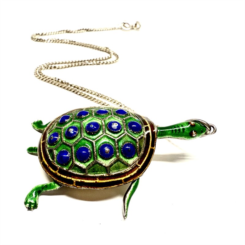 Nevšední náhrdelník - hladký řetízek s odnímatelným, větším závěsem. Šperk byl zhotoven ze sterlingového stříbra 925/1000, o celkové váze 13,99 g. Šperk věrně znázorňuje želvu a je celoplošně zdoben barevnými smalty. Želva má pohyblivé končetiny. Délka řetízku 41,5 cm, rozměry závěsu cca 5 x 3 cm. Výborný stav.