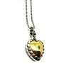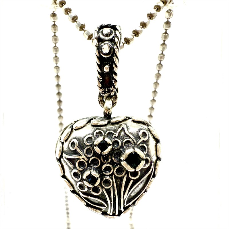 Půvabný stříbrný náhrdelník - řetízek zdobený odnímatelným závěsem ve tvaru srdce. Závěs je zdoben z přední strany plastickým, florálním motivem. Středy květin jsou osazeny tmavě modrými safíry. Střed zadní části zdobí zlacení a bílý kámen briliantového brusu, díky velkému, rozevíratelnému očku skýtá závěs možnost použití i na tlusté náhrdelníky. Sterlingové stříbro (925/1000), celková váha 12,89 g. Délka řetízku 41,5 cm. Perfektní stav.