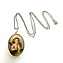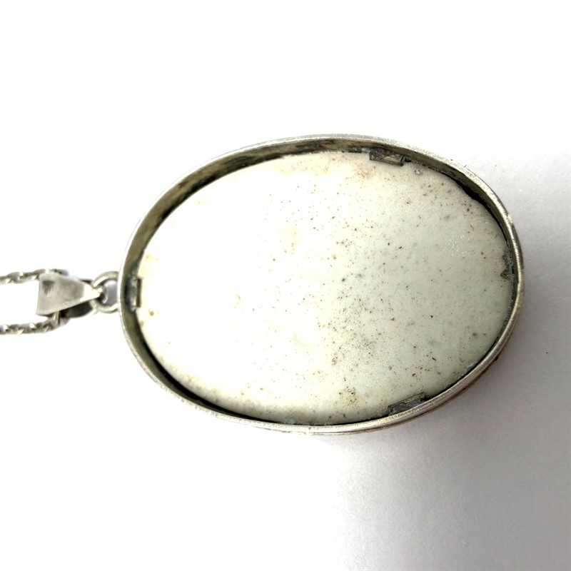 Stříbrný náhrdelník s větším, malebným závěsem s vyobrazením anděla. Šperk byl zhotoven ze sterlingového stříbra (925/1000). Celková váha 10,78 g. Délka řetízku 62 cm, rozměry závěsu 4,5 x 2,5 cm.