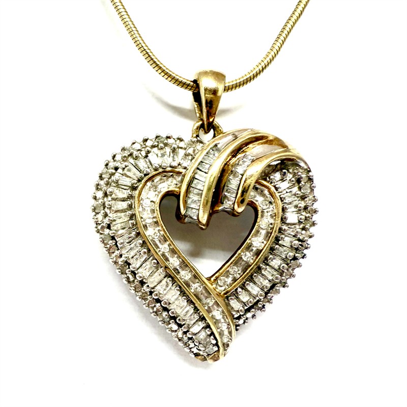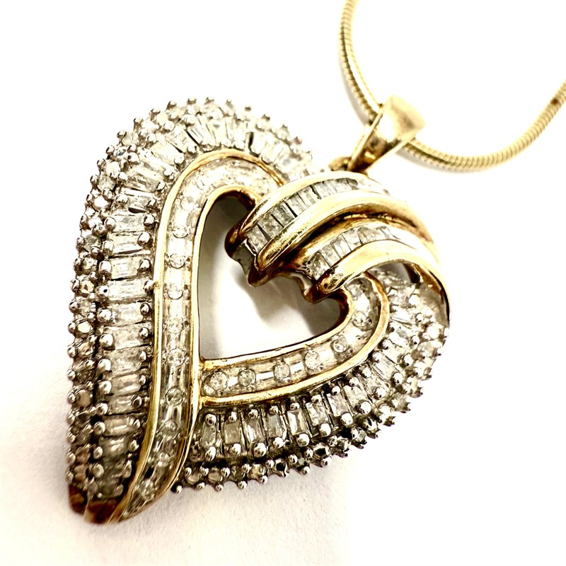 Půvabný, elegantní náhrdelník - hladký řetízek s odnímatelným závěsem ve tvaru srdce. Šperk byl zhotoven ze zlaceného sterlingového stříbra (925/1000), o celkové váze 8,96 g. Srdce je bohatě osázeno diamanty. Tyto drahokamy jsou přírodního původu. Délka řetízku 43 cm + 2,5 cm. Rozměry závěsu cca 3 x 2 cm. Perfektní stav.