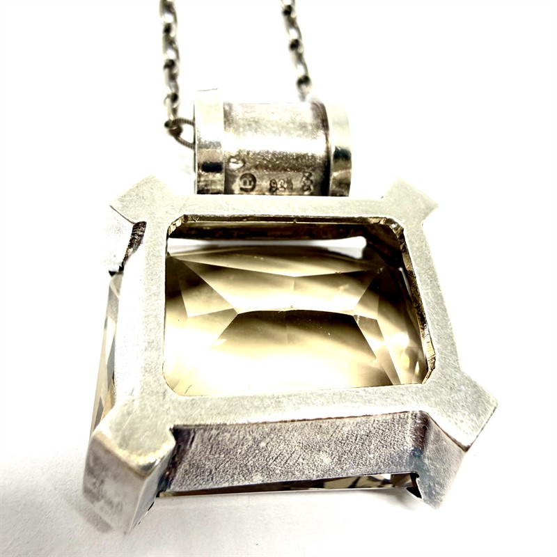 Designový, stříbrný náhrdelník s masivním, odnímatelným závěsem. Šperk je tvořen delším řetízkem s většími oky zdobenými intenzivním šrafováním. Dominantu šperku představuje výrazný závěs osazený velký kouřovým topazem. Stříbro sterlingové ryzosti 925/1000, řetízek stříbro ryzosti 835/1000. Celková váha 50,06 g. Délka řetízku je 60 cm, rozměry závěsu 3,6 x 3,2 cm. Značeno autorskou, ryzostí a puncovní značkou. Perfektní stav.