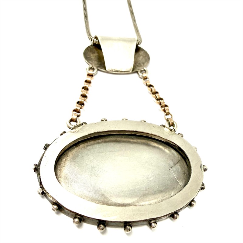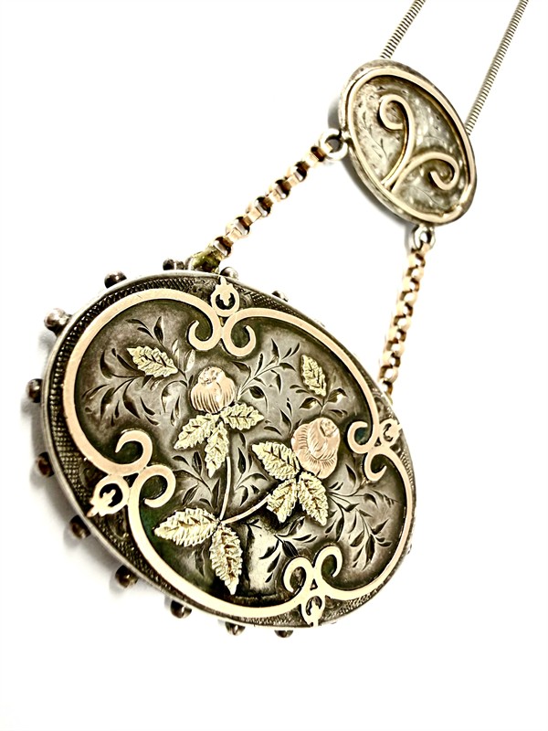 Originální, stříbrný náhrdelník, s velkým odnímatelným závěsem s detailně ztvárněným motivem růží. Šperk byl vyroben v první polovině 20.století ze stříbra sterlingové ryzosti (925/1000) a je mimořádně detailní a půvabně zdobný. Spojovací řetízky zhotoveny z obecného kovu. Celková váha náhrdelníku je 15,43 g. Délka hladkého řetízku 40 cm. Rozměry závěsu cca 6 x 4 cm. Osvědčení Puncovního úřadu. Perfektní stav.