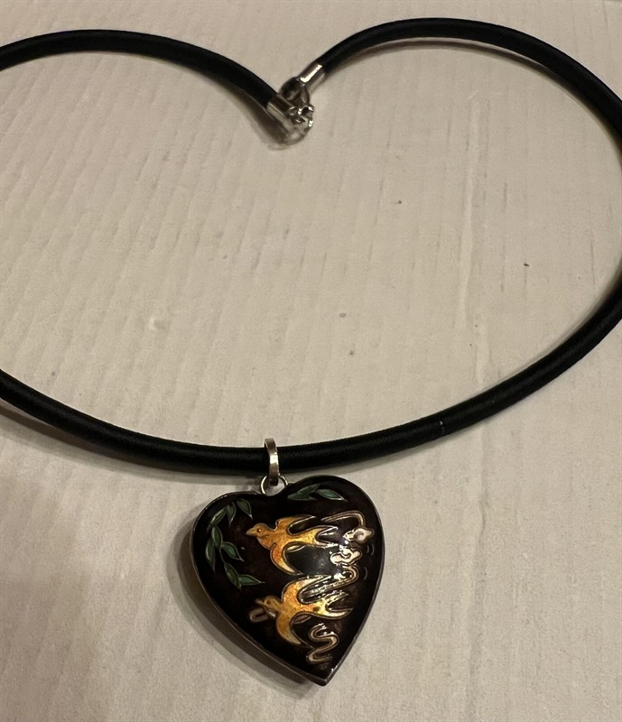 Stříbrný náhrdelnik ve tvaru srdce se smaltem s motivy ptáků, smalt je z obou dvou stran zcela zachovaly, Váha 3,89 g ,stříbro Ag 800 / 1000 platný punc, je navlečen na textilní šňůře s zapínáním z obecného kovu
