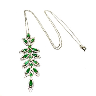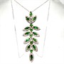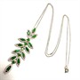 Půvabný, stříbrný náhrdelník zdobený velice dekorativním, odnímatelným závěsem. Šperk znázornující větévku je osazen 17ti přírodními smaragdy sytějšího zeleného odstínu. Smaragdy rámují drobné kubické zirkonie s vysokou brilancí. Šperk byl vyroben ze sterlingového stříbra (925/1000), o celkové váze 10,96 g. Délka řetízku 55 cm, závěs 6 cm. Perfektní stav.