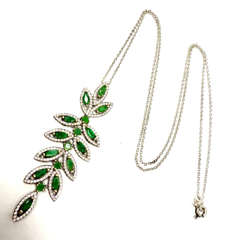 Stříbrný náhrdelník zdobený závěsem se smaragdy