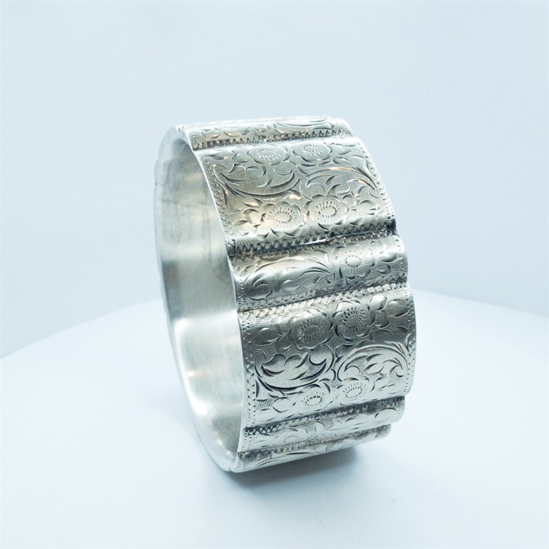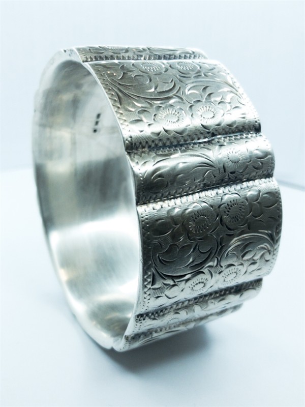 Starožitný masivní stříbrný kulatý náramek, Čechy, 20. - 30. léta 20. století, období Art Deco, stříbro o ryzosti 900/1000 o celkové hmotnosti 74,39 g, průměr náramku: 7 cm, šířka náramku: 3,5 cm