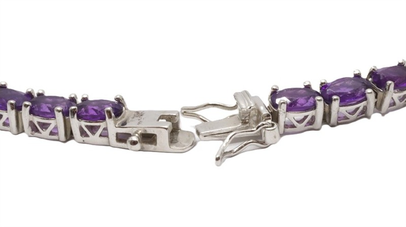 Stříbrný náramek s ametysty. Stříbro 925/1000. Přírodní ametysty, celková váha 12 ct. Váha náramku: 14,34 g. Délka náramku: 19,5 cm.