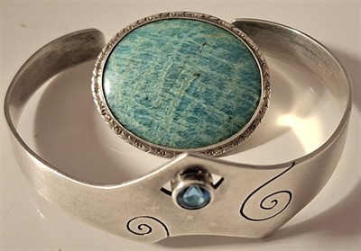 Stříbrný náramek s modrým kamenem, nově puncováno (výdajová boleta PÚ), stříbro, ryzost 925/1000, hmotnost 22,7 g, světlé modrý kámen (syntetický safír 1,25 karátu) mírný ovál, 6,5 x 7 cm Oválná brož s centrálním amazonitem, (puncováno slovenský dvojkříž 5), stříbro 800/1000, mistr značka JN v oválu, hmotnost , rozměr 32 x 37 mm, 9 g, art deco, počátek 30 léta m.s.